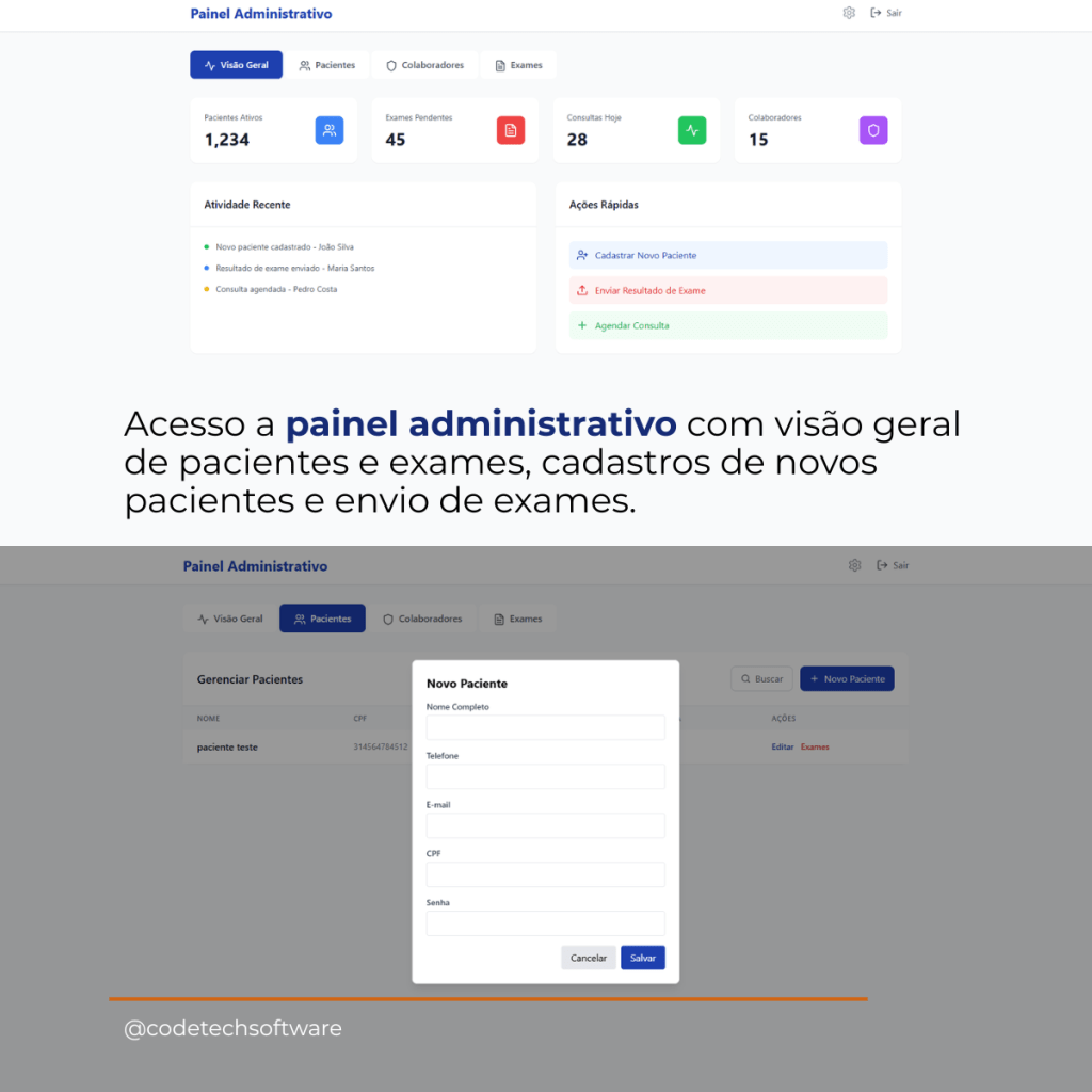 • Dashboard administrativo com KPIs em tempo real: exames pendentes, faturamento, taxa de ocupação